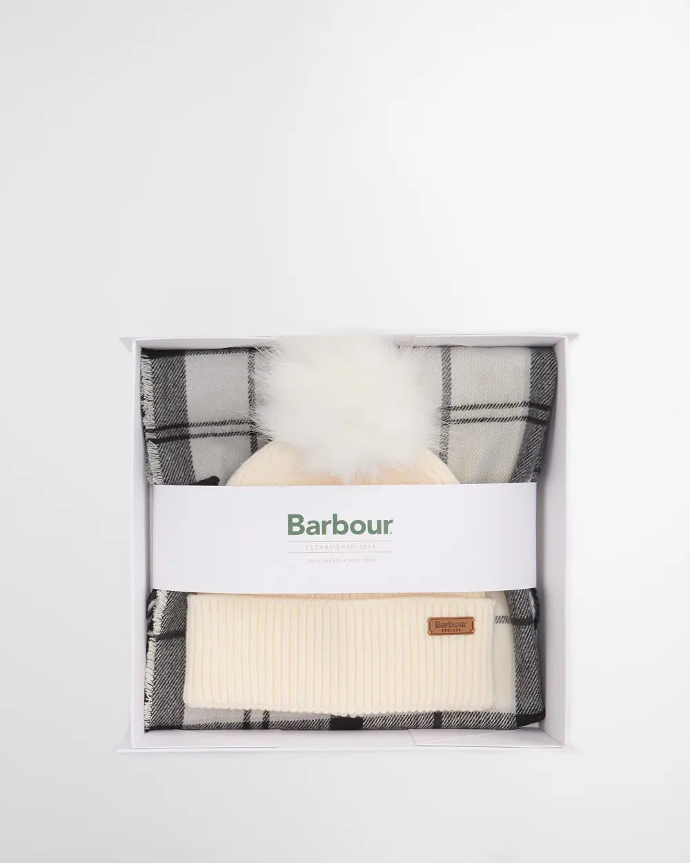 Regular price $90.00The Barbour Dover Beanie & Hailes scarf gift set includes a knitted beanie with faux fur pom and a 'Hailes' style tartan scarf with tassels. Presented in a smart gift box, the accessories are finished with a Barbour embossed badge to the hat.