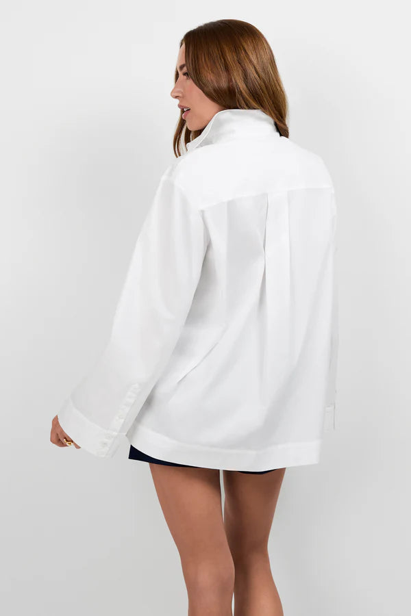 Getting dressed is a breeze in this comfortable swing top. Designed for an oversized fit, this easy yet elevated top features a button front closure, collar, drop shoulder, trumpet sleeve with button-up cuff, shirttail hem, and box center pleat at the back. It is made of our stretch poplin for a cool, comfortable feel.
