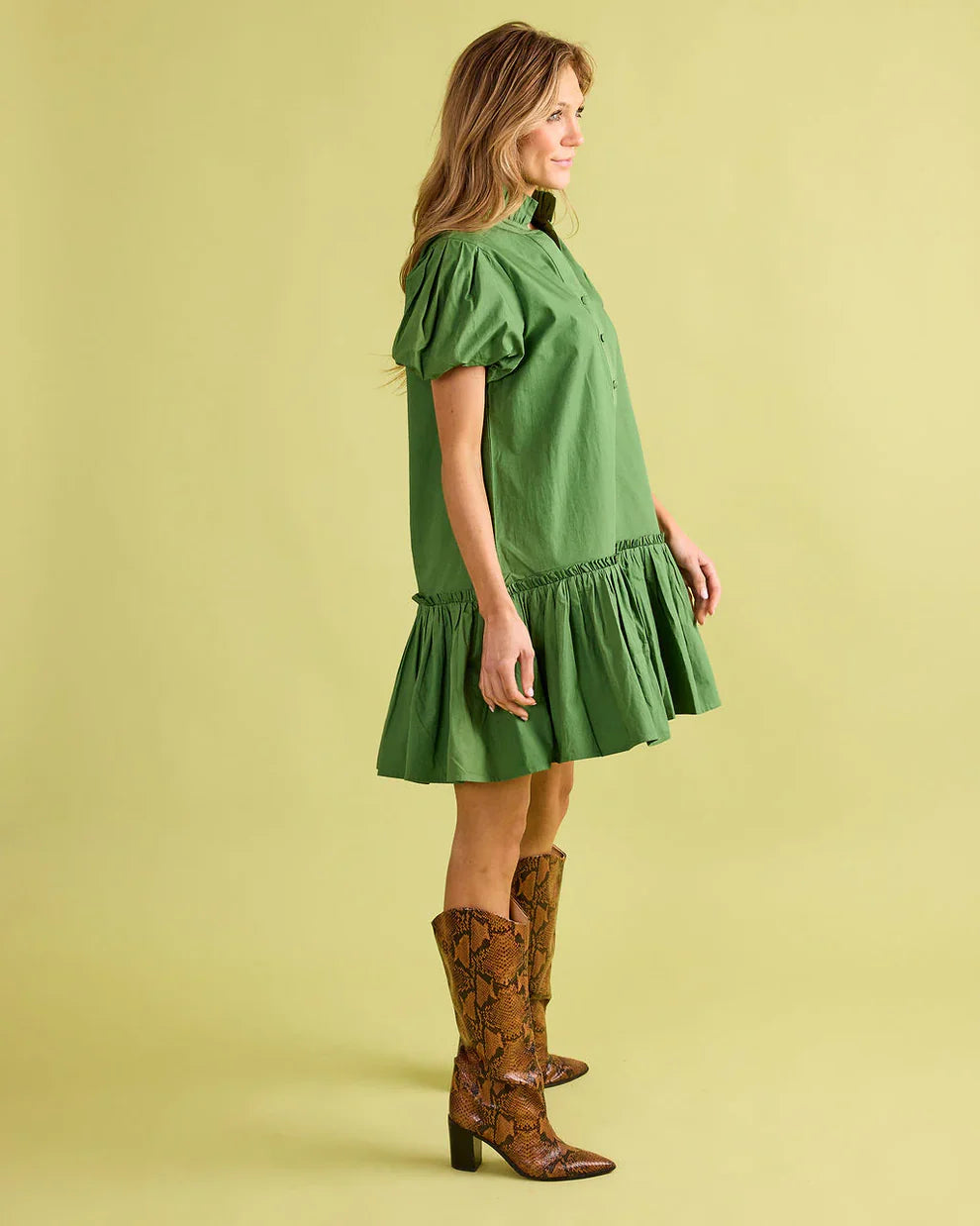 The Gia Dress is a perfect blend of timeless charm and modern style. This short puff sleeve dress features a ruffled mock neck with button-front detailing, and a drop waist ruffled skirt for an additional touch of flare.