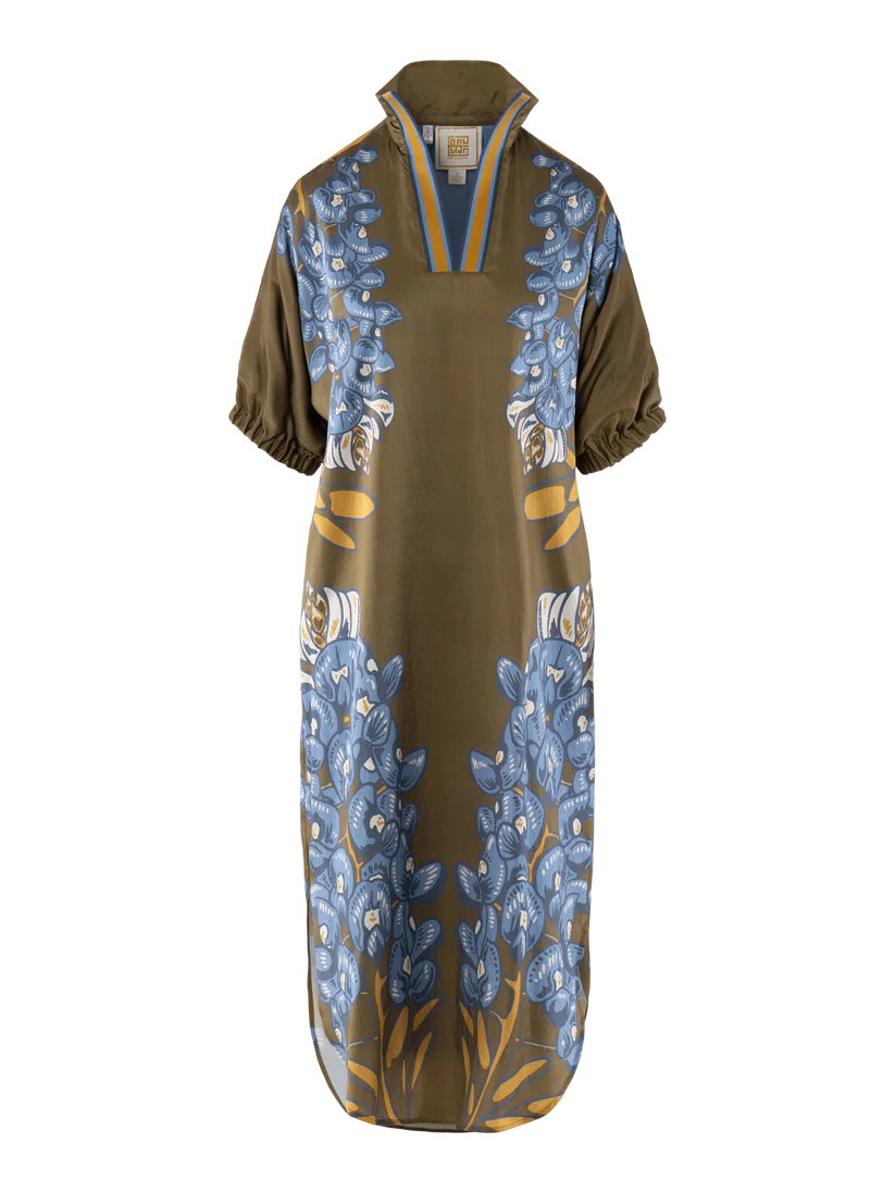The Hampton Dress in Boot Print showcases an abstract pattern created from interlocking boot outlines, a nod to western heritage reimagined with modern flair. The black and ivory woven fabric adds soft texture and visual dimension, giving the design depth and character. This midi-length silhouette features a mandarin collar, V-neckline, puff sleeves, and a trapunto-stitched hem, finished with functional side seam pockets for effortless wear.