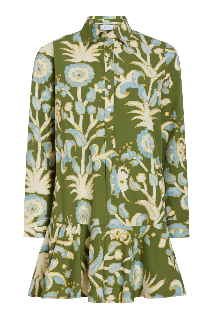 The Liv Dress is a playful mini dress with a tailored bodice and a relaxed drop-waist silhouette. It features short puff sleeves with cuff detailing, a classic shirt collar, and a partial button placket down the front. The skirt is finished with a flounced hem for a feminine, swingy shape.