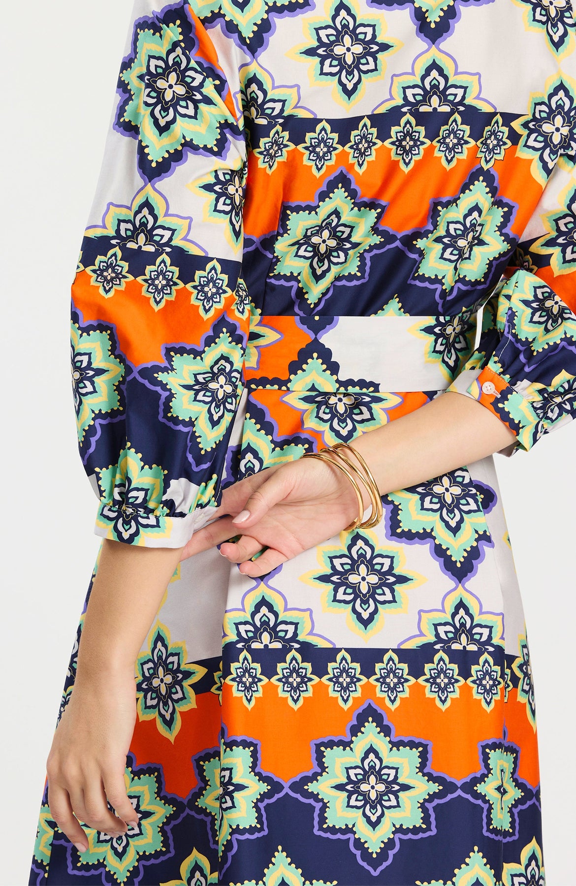 Regular price $298.00This standout midi dress is designed to make getting dressed effortless and memorable. Featuring a vibrant, artistic print layered with bold florals and geometric motifs, it brings color and personality to a timeless silhouette. The relaxed shape and flattering length make it easy to wear, while the three-quarter sleeves add polish and versatility. Style it with a sandal or heel for daytime events, then dress it up with statement jewelry for evening—this is the kind of piece that does all the work for you.