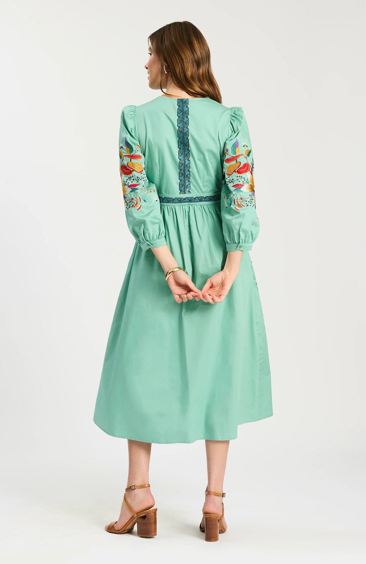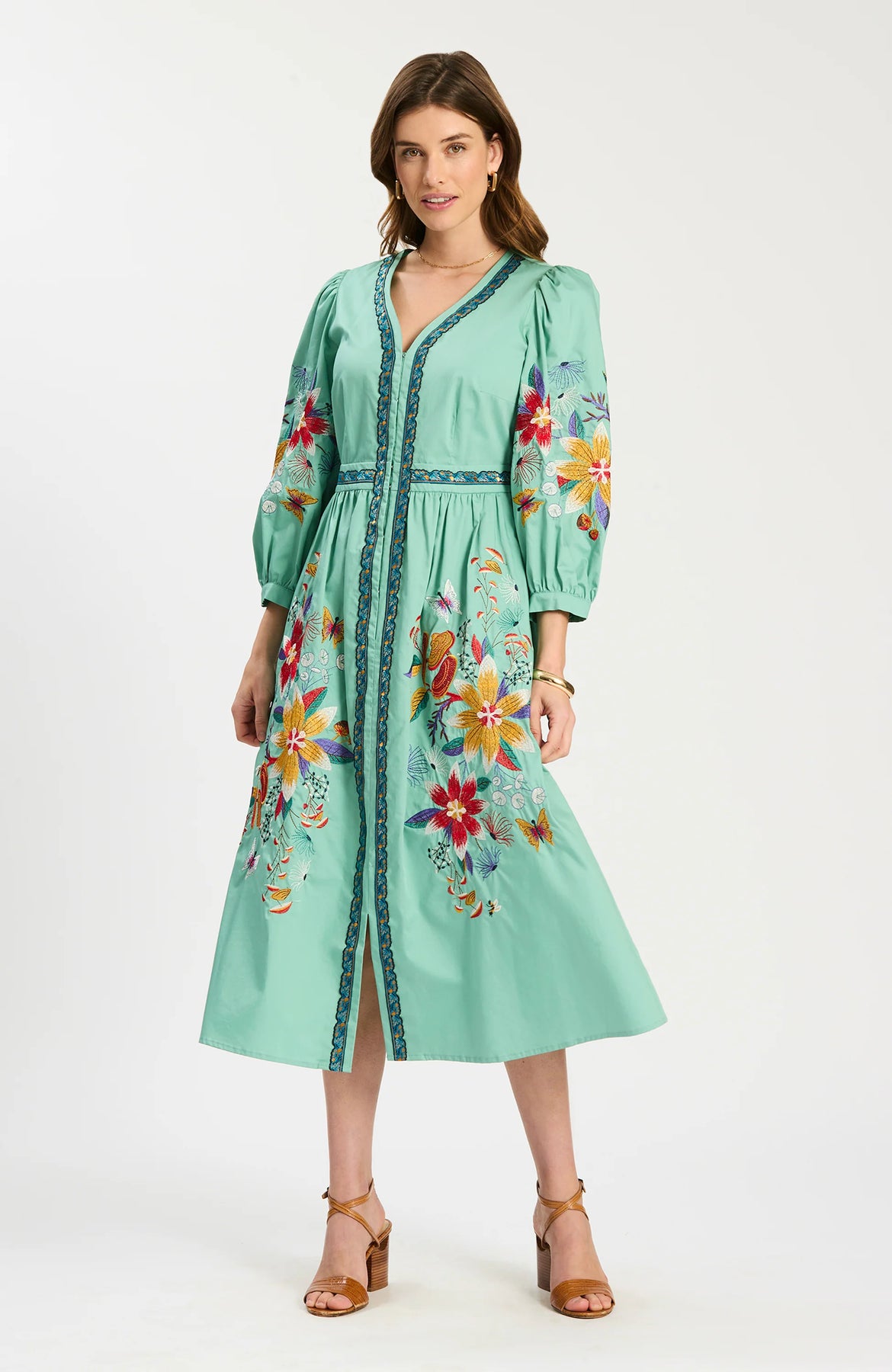 Regular price $367.00This beautifully detailed midi dress is a true statement piece, designed to feel special yet effortless. Set in a soft seafoam hue, it features vibrant floral embroidery that adds color, texture, and a handcrafted feel throughout. The gently structured bodice, flattering waist seam, and flowing skirt create an easy, feminine silhouette, while the long sleeves with subtle volume add an elevated touch. Wear it with sandals for daytime events or dress it up with a heel for dinners and celebrations—this is the kind of dress that turns heads without trying too hard.
