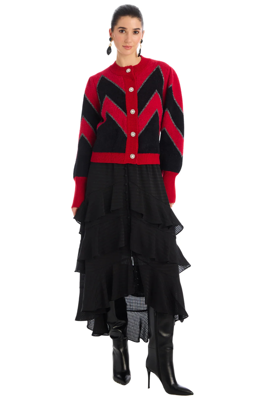 The Fuzzy Chevron Cardigan in a striking red & black combo adorned with oversized pearl and crystal buttons. Slightly cropped in length and designed with a billowing sleeve leading into an elongated ribbed cuff. A hint of metallic throughout makes this sweater perfect to dress up.